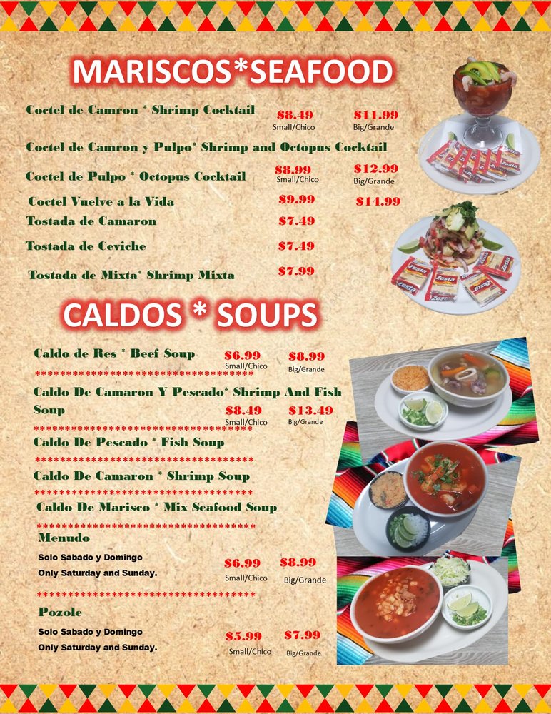 Caldo de Marisco: Mix of seafood in savory broth. Available in small or big sizes.