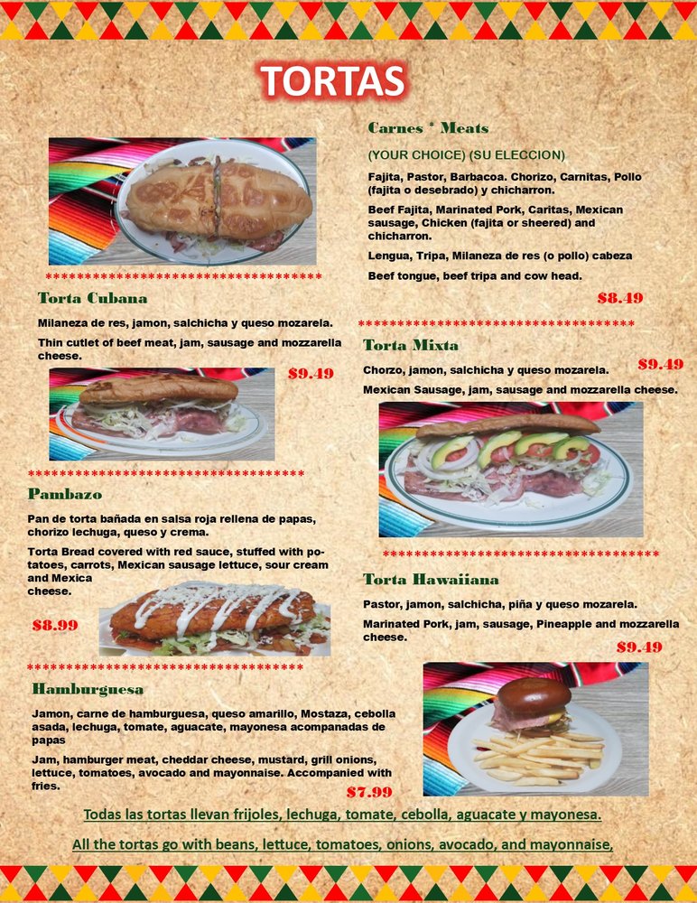 Mexican sausage, mozzarella cheese, ham and sausage. Prepared with beans, lettuce, tomato, onion, avocado and mayonnaise / Chorizo, queso mozzarella, jamon y salchicha. Preparadas con frijoles, lechuga, tomate, cebolla, aguacate y mayonesa.