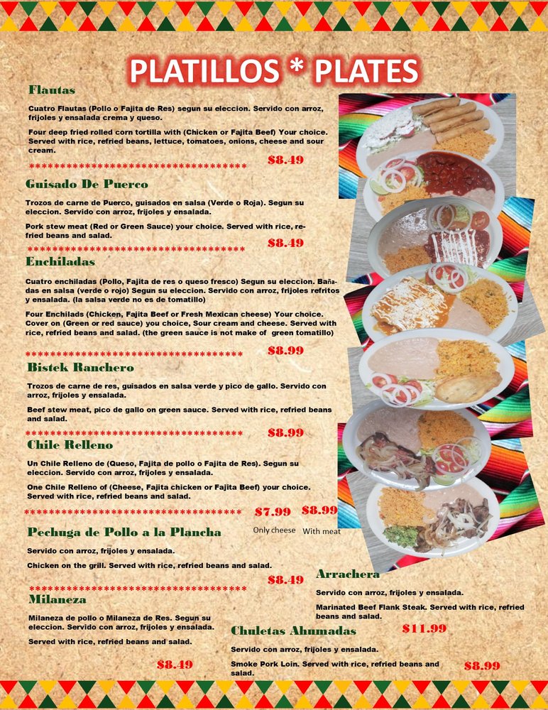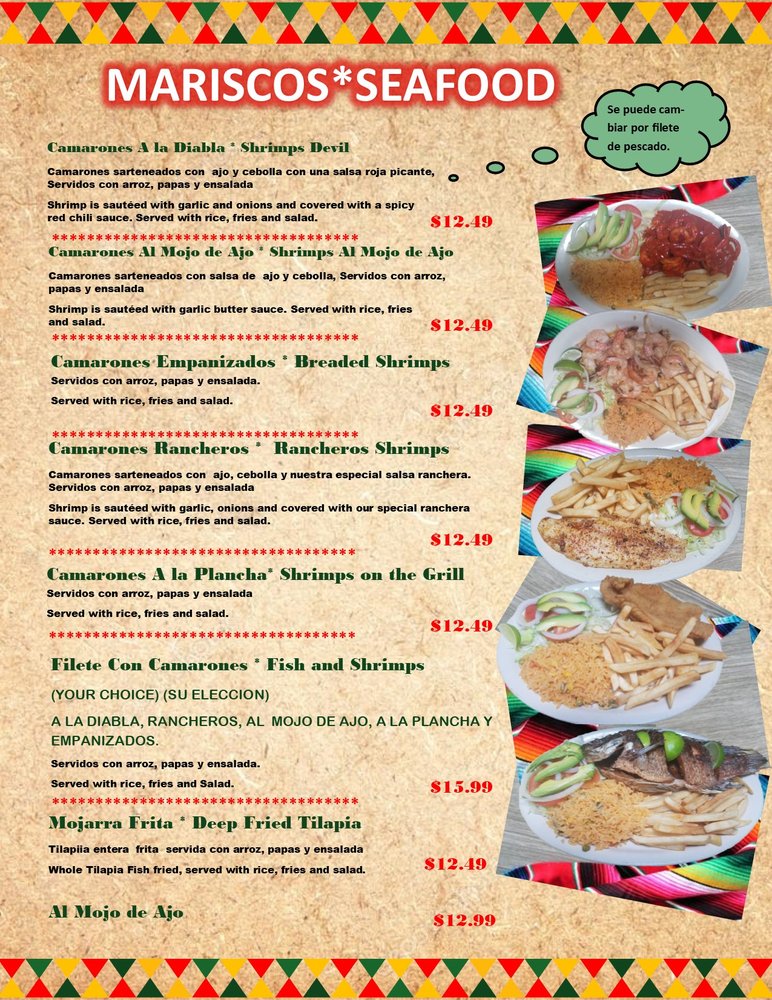 Your choice: A la Diabla, Al Mojo de Ajo, Breaded, Grilled and Rancheros/ A su eleccion: A la Diabla, Al Mojo de Ajo, Empanizado, A la Plancha y Rancheros. Served with rice, potatoes and salad/ Servido con arroz, papas y ensalada