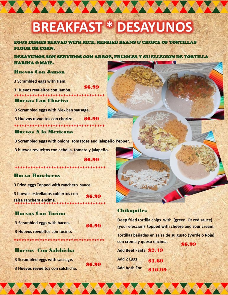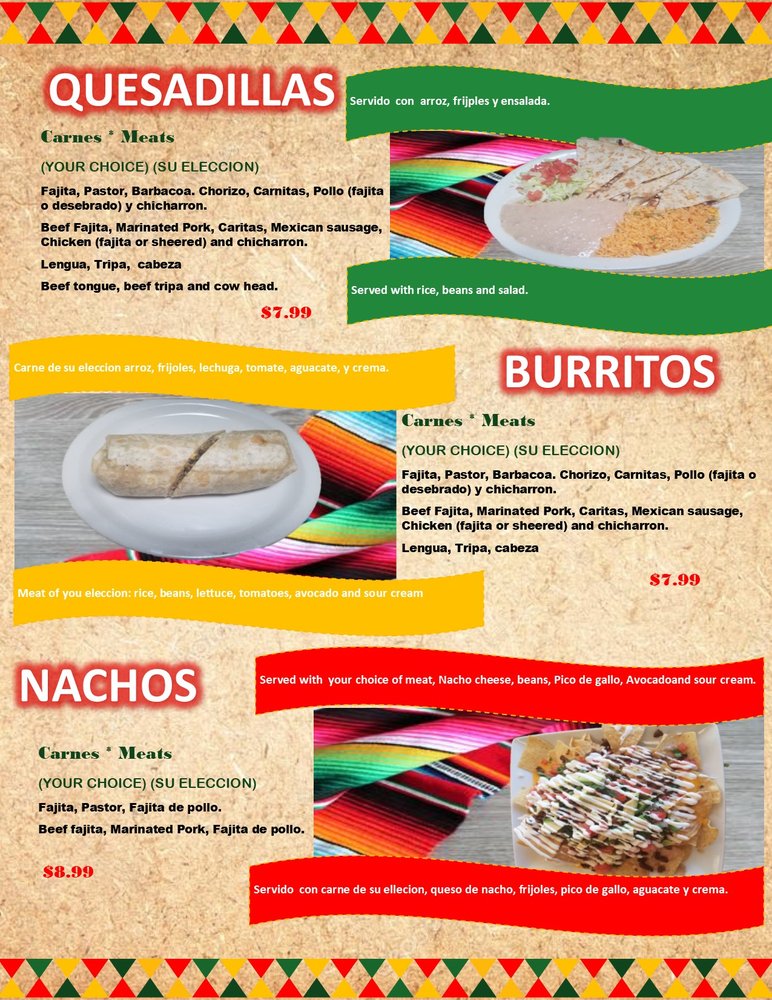 Green or red / Verdes o rojos. Served with beans and rice, corn tortilla or flour / Servidos con frijoles y arroz, tortilla de maiz o harina