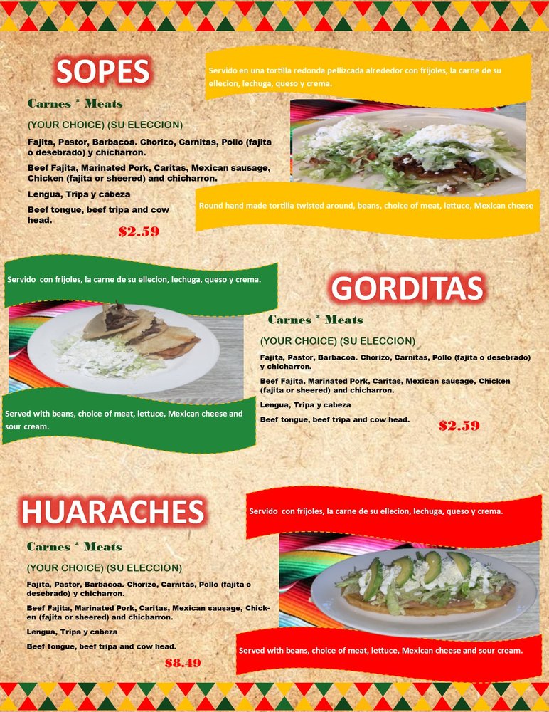 Handcrafted sopes with your choice of meat: barbacoa, carnitas, pork rind, sausage, fajita, pastor, chicken, beef head, tongue, or tripe.